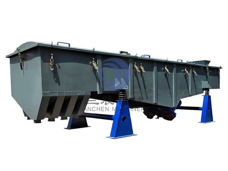 SC系列直线振动筛为双振动电机驱动。当两台振动电机做同步、反向旋转时,其偏心块所产生的激振力在平行于电机轴线的方向相互抵消,在垂直于电机轴的方向叠为一合力,因此筛机的运动轨迹为一直线。两电机轴相对筛面在垂直方向有一倾角,在激振力和物料自重力的合力作用下,物料在筛面上被抛起跳跃或向前作直线运动,从而达到对物料进行筛选和分级的目的。适用于粒度在0.074-5mm,含水小于7%,无粘性的各种干式粉状或颗粒状物料的筛分,给料粒度不大于10mm.